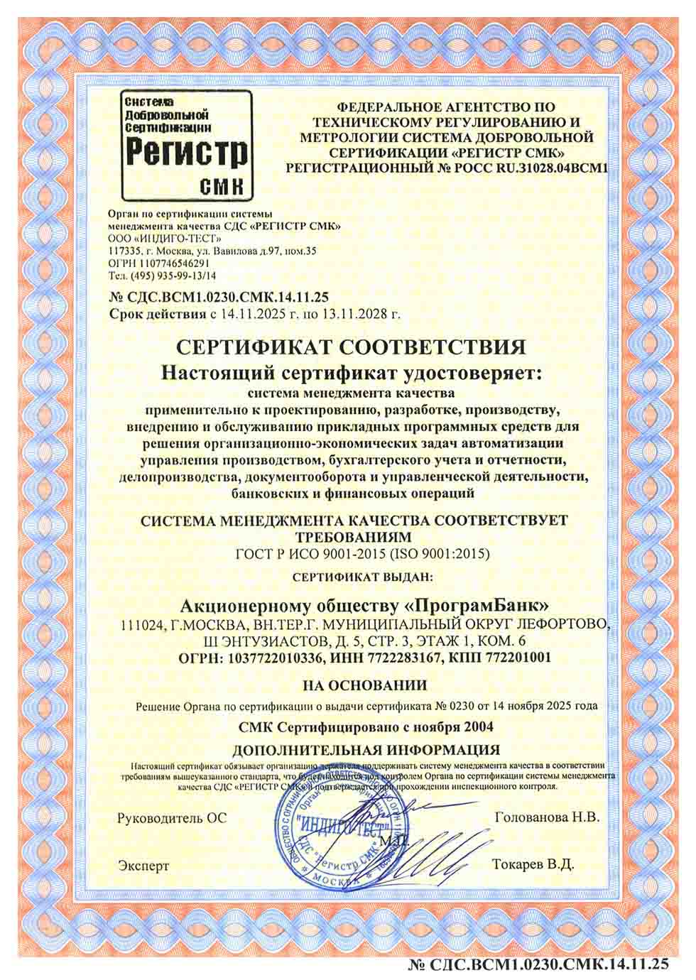 № СДС.ВСМ1.0230.СМК. от 14.11.2025 Срок действия с 14.11.2025 г. по 13.11.2028 г. СЕРТИФИКАТ СООТВЕТСТВИЯ Настоящий сертификат удостоверяет: система менеджмента качества применительно к проектированию, разработке, производству, внедрению и обслуживанию прикладных программных средств для решения организационно-экономических задач автоматизации управления производством, бухгалтерского учета и отчетности, делопроизводства, документооборота и управленческой деятельности, банковских и финансовых операций Система менеджмента качества соответствует требованиям ГОСТ Р ИСО 9001-2015 (ISO 9001:2015) Сертификат выдан: Акционерному обществу «ПрограмБанк» 111024, г. Москва, вн.тер.г. Муниципальный округ Лефортово, шоссе Энтузиастов, дом 5, стр.3 ОГРН: 1037722010336, ИНН: 7722283167, КПП: 772201001 |